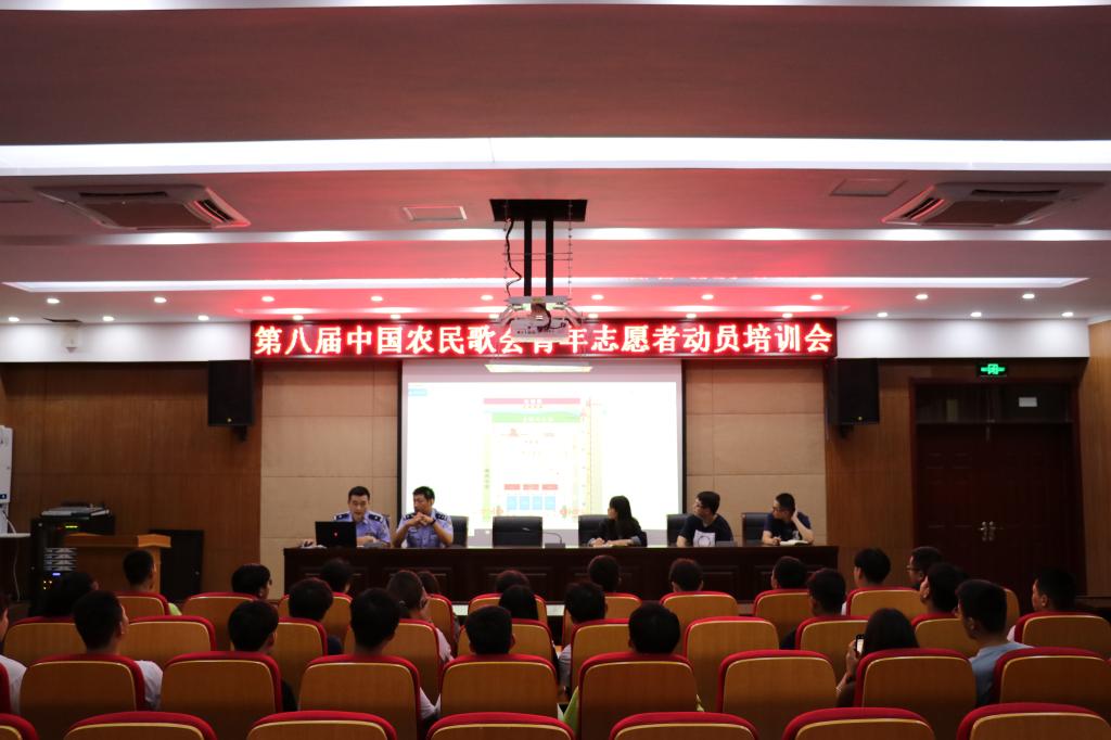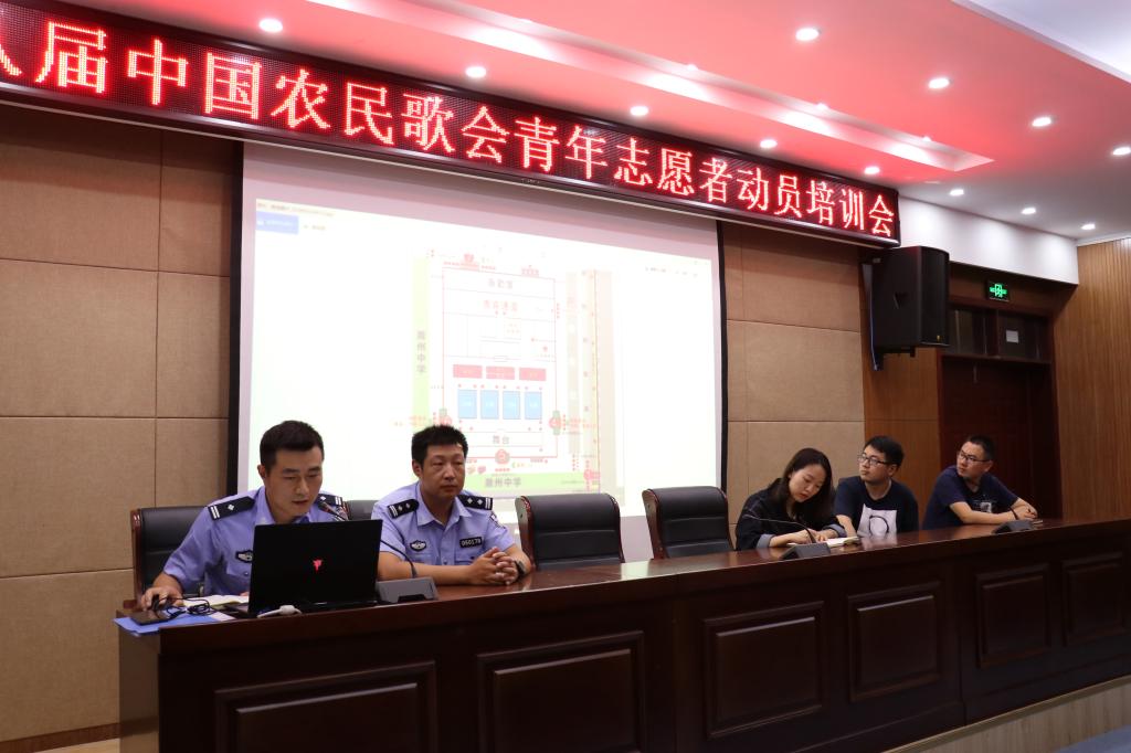 为出色地完成第八届中国农民歌会志愿服务,展现整齐划一、训练有素的良好形象,2019年9月18日,Beat365小青亭志愿者们在南阶205会议室召开第八届中国农民歌会青年志愿者培训会,市公安局治安支队行动队大队长张涛、治安支队行动队大队教导员王磊、团市委宣传部副部长陈玉晟、校团委倪子旭、毕初老师及30余名安保组志愿者参加此次会议。
