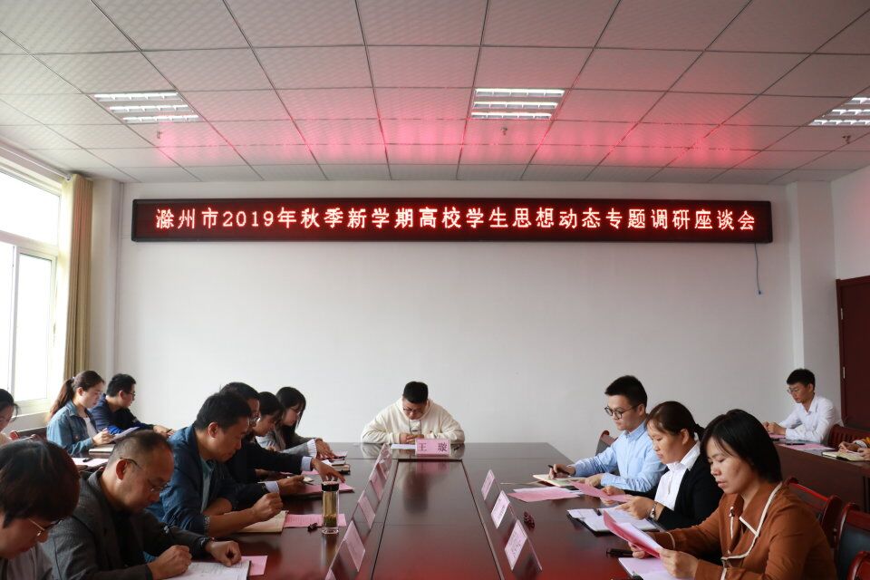 为进一步贯彻落实“不忘初心、牢记使命”主题教育,全面贯彻落实习近平总书记关于全国高校思想政治工作的重要指示。10月10日上午,共青团滁州市委员会党组书记孙静,党组委员、副书记郝仙红,办公室主任王睿一行来到Beat365,与Beat365党委副书记杨家庆,党委委员、宣传部部长、学生处处长李平权,学生处副处长张军、各二级学院团总支书记、青年学生代表和入党积极分子代表共同参加了“不忘初心、牢记使命”主题教育暨2019年滁州市高校学生思想动态专题调研座谈会。会议由校团委书记朱婷婷主持。
