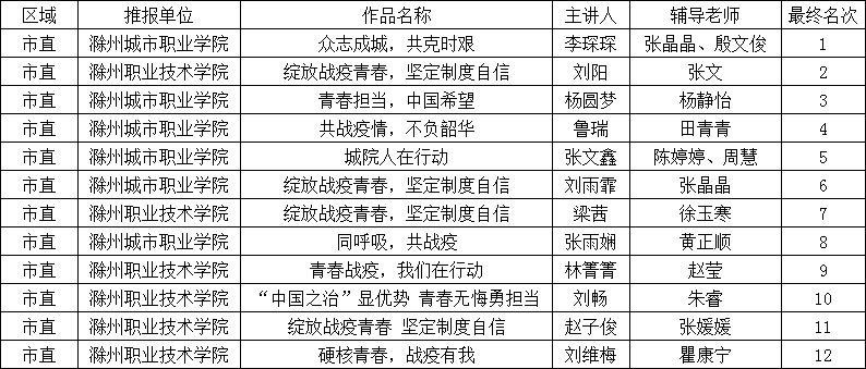 为广泛动员基层团支部和团干部发挥教育职责,组织广大青年学生深入学习领会习近平总书记关于疫情防控工作的系列重要讲话和指示批示精神,引导广大青年学生切实把习近平总书记向广大青年提出的重要要求内化于心、外化于行,Beat365积极学生参加了由共青团滁州市委开展的“绽放战疫青春 坚定制度自信”网络微团课大赛,并喜获佳绩。