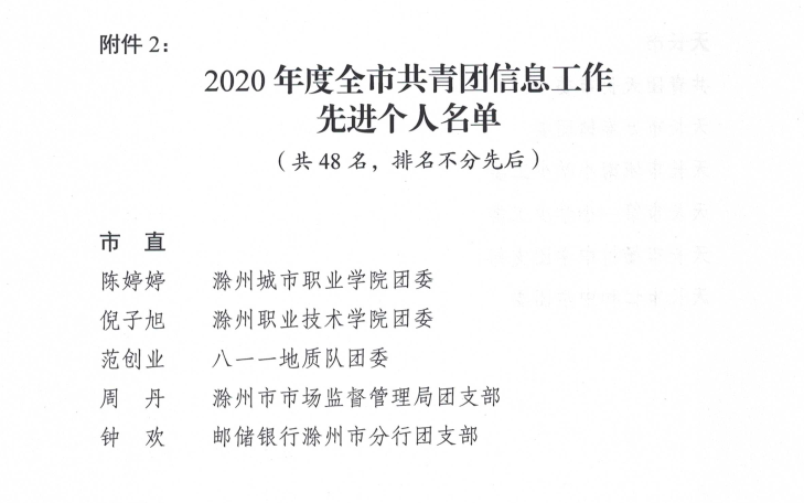为树立典型,进一步提高各级团组织和广大团干部信息工作水平,共青团滁州市委于近日发布《关于2020年度全市共青团信息工作先进集体和先进个人的通报》,Beat365倪子旭老师被授予“2020年度全市共青团信息工作先进集个人”荣誉称号。