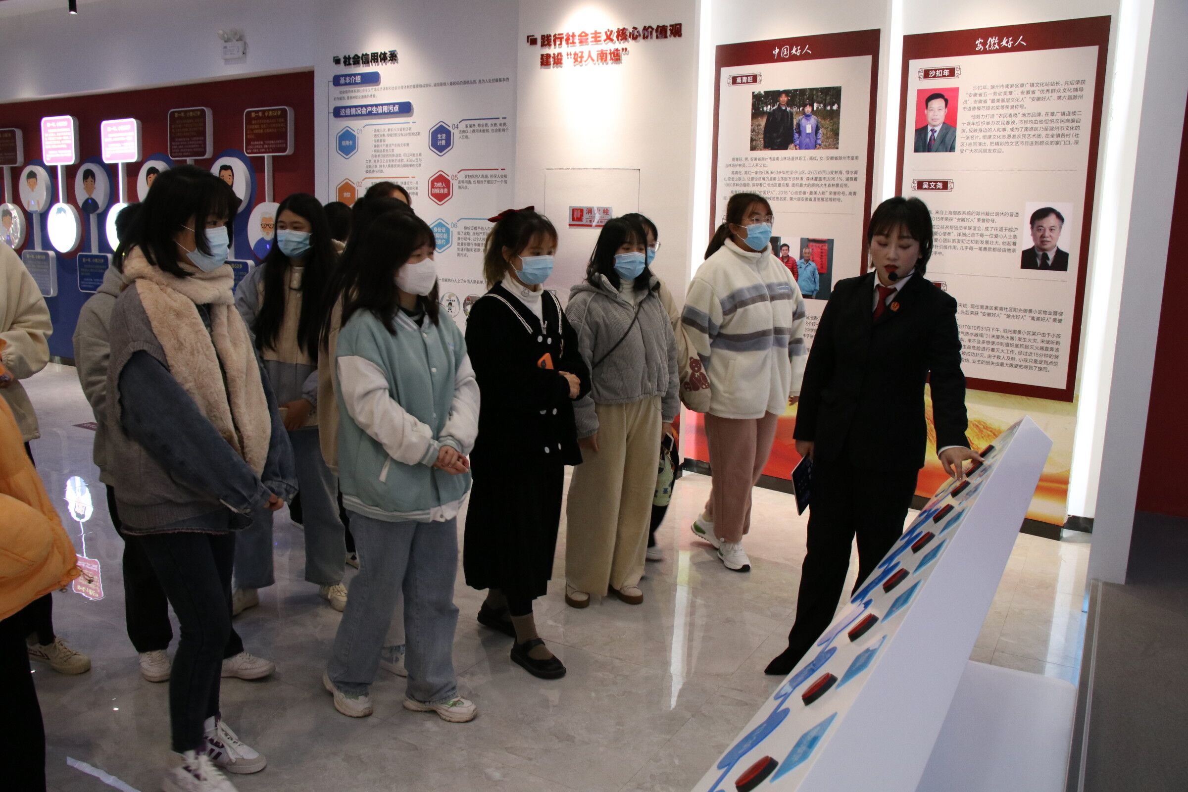在法制教育基地,同学们认真听取工作人员的讲解。首先参观了乌衣法院的立案庭、信访接待室、羁押室、法庭、反腐倡廉长廊、毒品展示区等场所随后集体观看了乌衣法院宣传片,使大家对乌衣法院的审判工作、司法改革、多元化纠纷解决机制、司法便民服务等工作情况有了全面的了解。最后同学们参观了南谯区法治教育体验馆,该馆内设序厅、大国方针、法伴一生、护蕾成长与尾厅5个主题展区尤其在护蕾成长展厅,通过生活情景模拟的形式将生活中存在的法律问题展现出来,进一步加深了同学们对身边法律法规的认识