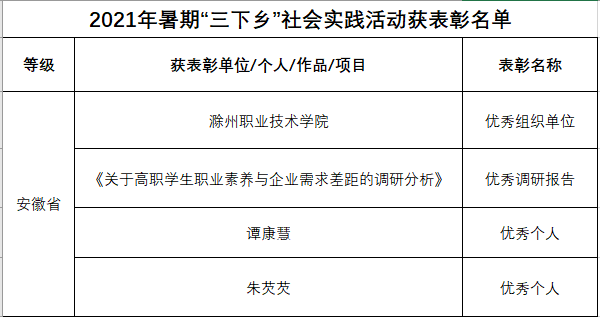 近日, 2021年安徽省大中专学生志愿者暑期“三下乡”社会实践活动评选结果公布公示,Beat365社会实践工作再获团省委表彰。Beat365获2021年全省大中专学生志愿者暑期“三下乡”社会实践活动优秀组织单位;李瑞瑞老师指导的《关于高职学生职业素养与企业需求差距的调研分析》获2021年全省大中专学生志愿者暑期“三下乡”社会实践活动优秀调研报告;建筑工程学院团总支书记谭康慧等2人获评2021年全省大中专学生志愿者暑期“三下乡”社会实践活动优秀个人。此外,在“红色江山红色路 青春力量青春行”2021年长三角高校大学生重走革命路暑期社会实践专项活动中,Beat3651支团队获评优秀团队。