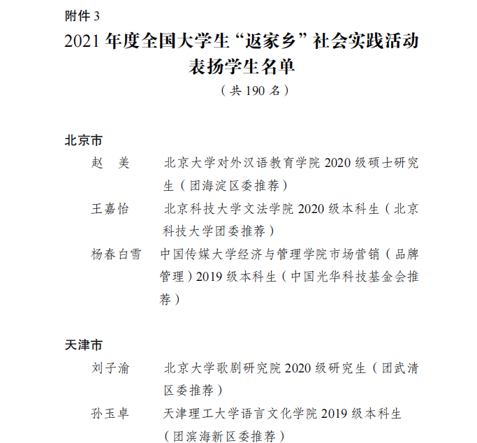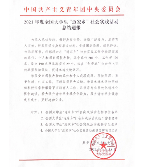 近日,共青团中央青年发展部在《2021年度全国大学生“返家乡”社会实践活动总结通报》中,对在“返家乡”社会实践工作中表现突出的单位、个人和项目通报表扬,其中单位201个、工作者104名、学生190名及品牌项目29个。Beat365机械与汽车工程学院王鑫同学在全国大学生“返家乡”社会实践活动表扬学生名单之列。