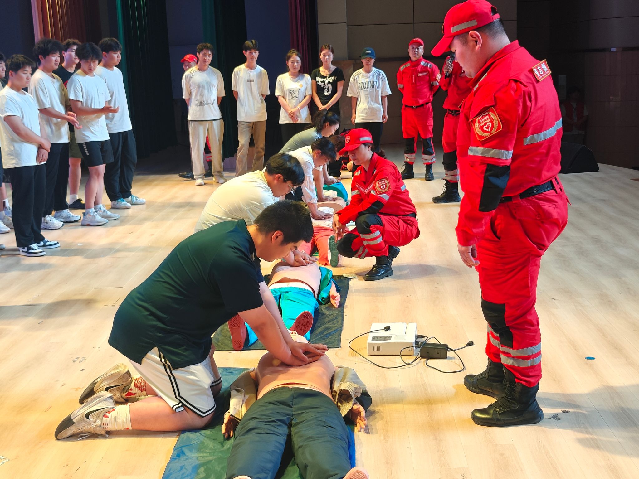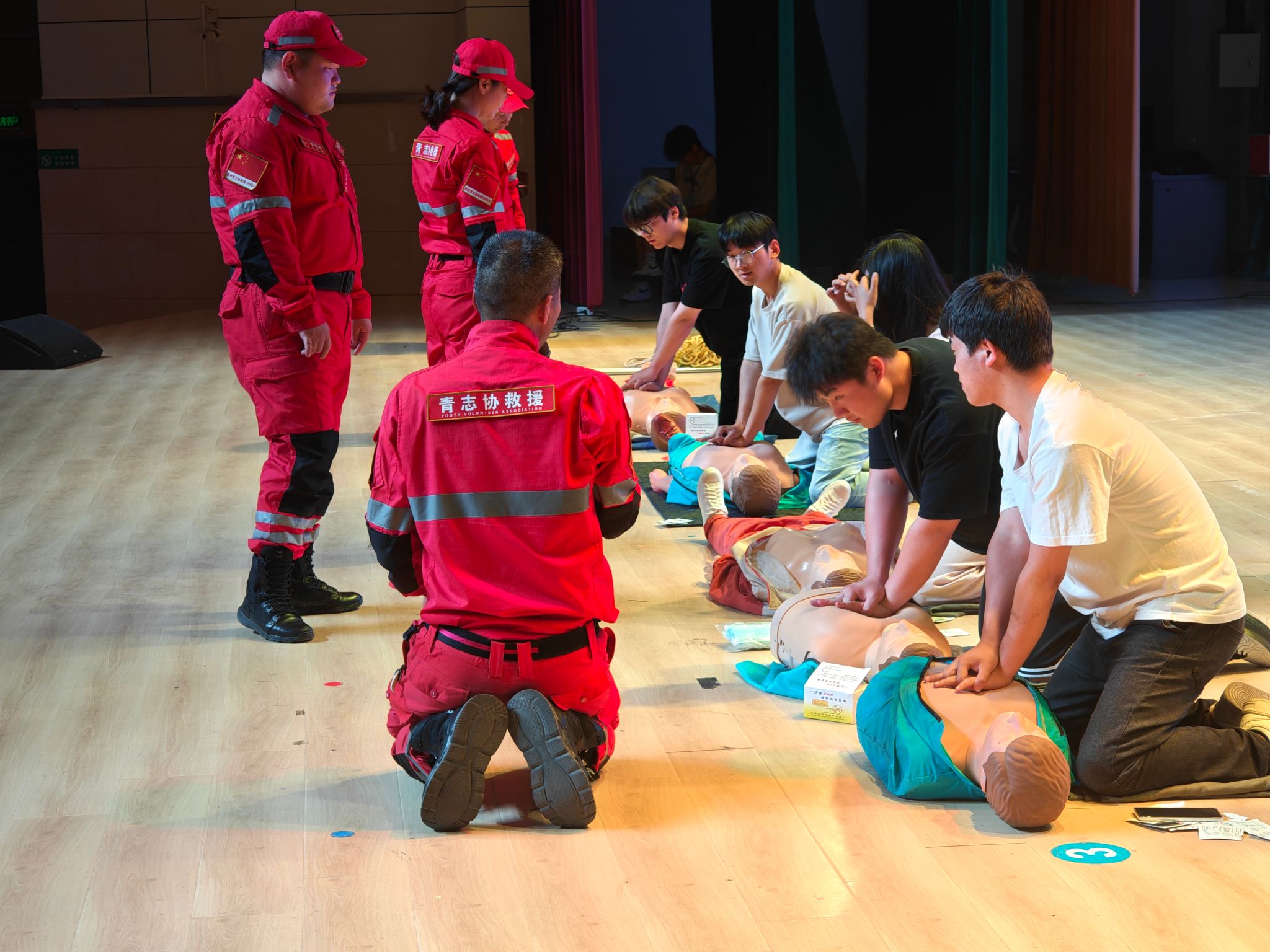 理论学习结束后,紧张而有序的实操演练环节正式开始。参与学生在专业人员的引导下,有条不紊地进行疏散逃生演练,将刚刚学到的逃生知识运用到实际中。同时,学生们被分成小组,在救援队成员一对一的现场指导下,开展心肺复苏、伤口包扎等基础急救技能的练习。同学们积极参与,认真操作,力求每一个动作都做到规范、标准。