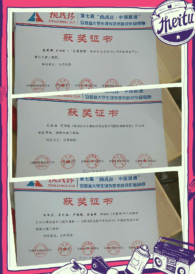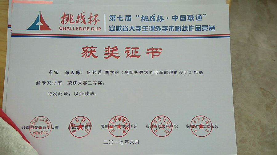 6月3日—5日,安徽省第七届“挑战杯”大学生课外学术科技作品竞赛终审决赛在安徽理工大学举行。我院参赛团队在比赛中共获得二等奖1项,三等奖3项,这是我院学生首次参加“挑战杯”竞赛。