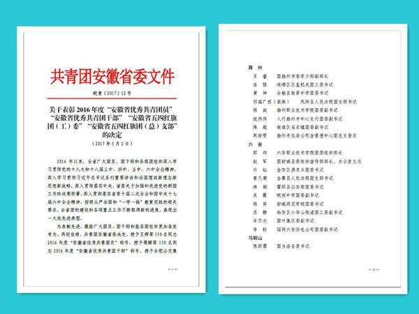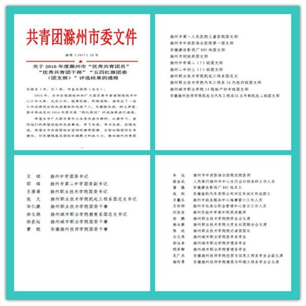 五四青年节来临之际,我院共青团荣获多项荣誉表彰。院团委副书记程诚同志被授予“全省优秀共青团干部”荣誉称号,机电系团总支和汽车系16汽检4班被授予“全市五四红旗团(总)支部”荣誉称号,院团委书记王蓓蓓、机电工程系团总支书记张文、汽车工程系团总支书记朱婷婷、团委干事华仁康授予滁州市“优秀共青团干部”荣誉称号。俞鹏、谢永康、陈欣同学被授予滁州市“优秀共青团员”荣誉称号。