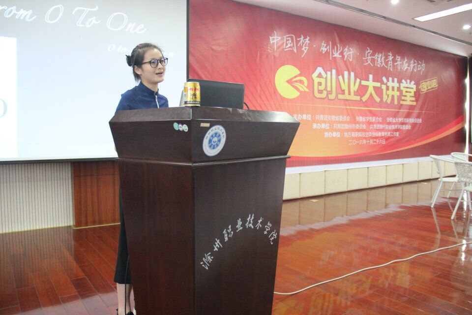 10月26日下午14:50,由共青团安徽省委员会、安徽省学生联合会、安徽省大学生创新创业促进会主办,共青团滁州市委员会、共青团Beat365唯一官方网站委员会承办,地方高职院校创新创业教育名师工作室协办的“中国梦·青年行·安徽在行动”的创业大讲堂活动在我院五楼报告厅隆重开讲。出席本次活动的领导有Beat365唯一官方网站党委委员、副院长吴大明、共青团安徽省委学校部部长曹隽、共青团滁州市团委书记孙枝娟、共青团安徽省委学校部王磊、许飞老师以及滁州市青年就业创业服务中心主任王清。我院职业发展协会、KAB俱乐部以及各系部具有创业意向的两百多名同学一起聆听了本次讲座。本次活动由地方高职院校创新创业教育名师工作室的负责人谢丽丽主持。