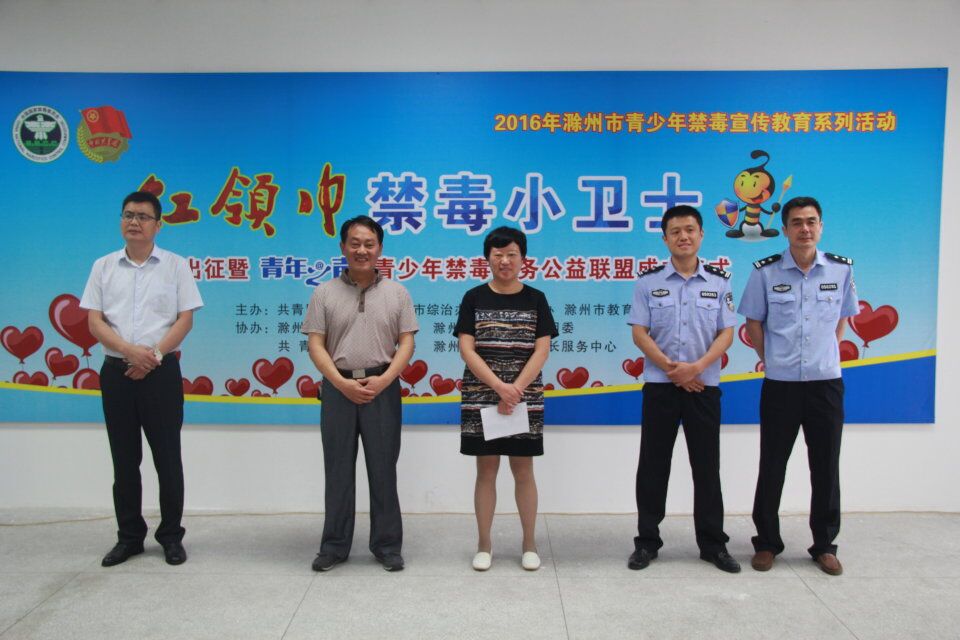 6月26日是国际禁毒日,为响应国家禁毒宣传教育的号召,6月24日上午9:00,由滁州市市综治办、团市委、市禁毒办、市教体局、市少工委联合举办的2016青少年禁毒宣传教育系列活动启动仪式在我院综合楼303举行,Beat365唯一官方网站党委副书记刘树俭、市委政法委、市综治办主任唐宗元、市教育体育局副局长张言平及滁州市禁毒支队俺负责同志出席了本次启动仪式。市属高校志愿者、50名少先队员、10名社工及社会组织代表参加了本次活动。启动仪式由团市委书记孙枝娟主持。