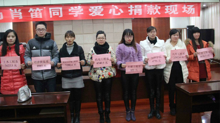 疾病无情人有情,学院团委得知肖笛同学的情况后,迅速向全院师生发出倡议,一场为了年轻的生命之花再度绽放的爱心捐款行动在学院全力起航。学院师生纷纷慷慨解囊、捐款相助,短短一周时间就募得44598元。在捐款过程中,一幕幕让人感动的情景不断发生着:院工会副主席朱进在看到倡议书后第一时间来到团委捐款;院工会副主席、总务处处长李有志和总务处马来军、朱国新、王磊、宋强等老师到现场捐款看到已经结束后又急匆匆集体来到团委办公室捐款;院督导室葛桂云老师路遇辅导员得知情况把自己身上所有的钱捐了出来;姜彩霞、晋华云、黄刚、王亭立、朱永勇、陈琴、赵李凤、李红艳等老师纷纷慷慨解囊,来到现场或委托他人进行捐款;徐强、王俊杰、葛永刚等同学到医院看望肖笛,送去温暖和鼓励……