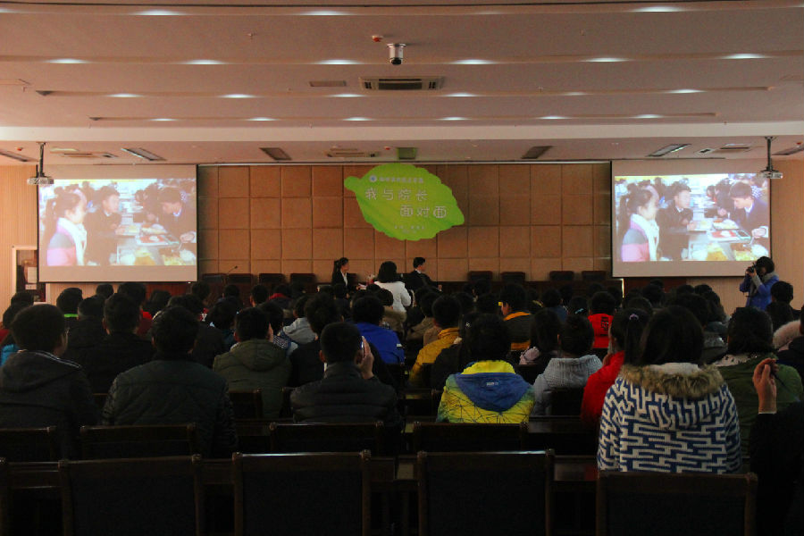 活动开始院长与大家共同观看了一段微电影,片中反映了同学们对学院的一些想法和建议。观影结束后,在接下来访谈中,院长对于如何处理学习和娱乐之间的关系、大学生恋爱、改善校园环境等问题为大家作了详细的回答。关于学习和娱乐,他提到:对于学习和娱乐要做到“学习不放松,娱乐不成瘾”,在学习方面要明确动机、做出目标、讲究方法,除了基础知识外,还要注重专业技能,要想学好必不可少的是吃苦耐劳的精神。当然正常的娱乐也必不可少,重要的是娱乐有个度,不能沉迷。其中院长还谈到自己学习的经历。对于大学生恋爱的问题,他的想法是“有爱自然好,无缘莫伤心”,对于大学生恋爱的利弊,不能一概而论,不赞成也不反对,作为一名学生,首先还是要明确大学期间的主要任务。之后是现场提问环节,学生代表都积极举手想要向院长提问,最后随即抽取五名学生进行提问,院长也耐心地一一解答,对学生提出的建议也做出了肯定,院长诙谐风趣的语言使现场气氛达到了高潮。本次活动还运用了微博话题讨论、微信上墙等新媒体技术,通过微博、微信与院长进行互动交流。并且院长对其中的几个问题进行了精彩的解答。他在人生和学习上给予同学们很多建议,例如希望大家可以多参加实践活动和实践技能型比赛。最后,院长衷心祝愿同学们在2016年可以“学到真知,找到真爱,获得真快乐”