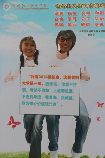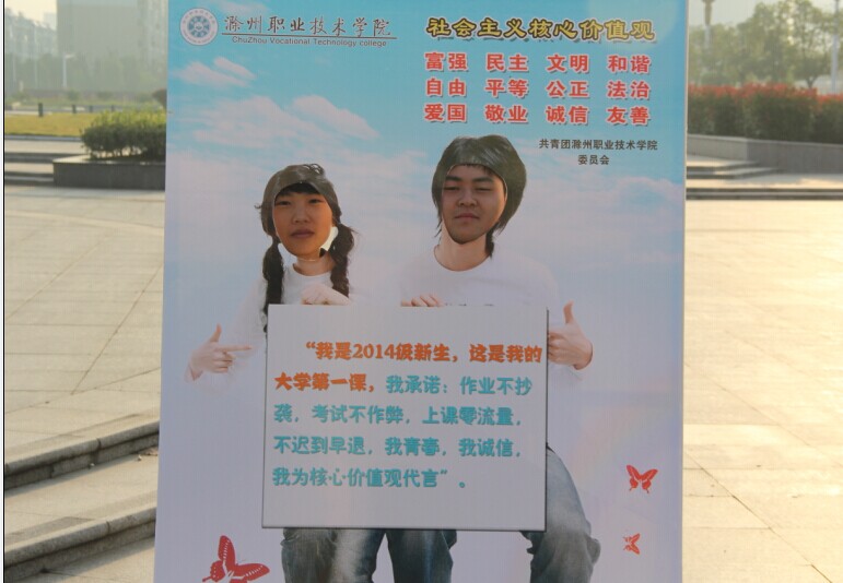 10月8日一早,Beat365唯一官方网站2014级新生在结束为期两周的军训后,开始了他们大学的第一课。当新生们路过教学楼时,惊喜的发现院团委的老师们给新生准备的开学第一课“礼物”——核心价值观代言墙。两个打扮青春的人偶矗立在教学楼入口处,上面清晰的标注着社会主义核心价值观“富强、民主、文明、和谐;自由、平等、公正、法治;爱国、敬业、诚信、友善”。