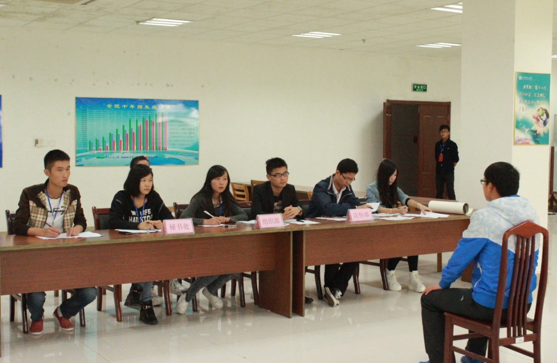 此次招新分为前期宣传和两轮面试组成,社联成员除了在校内宿舍区设报名点外,还积极投入班级进行宣传。社联各部门干事热情的为学弟学妹们介绍社团联合会,让学弟学妹们更好地了解这个集体。经过初次选拔,大学生社团联合会在21日综合楼进行了最后一轮严格的面试,团委副书记程诚老师和指导教师甄帅老师也参与了最后的面试。本次面试中社联的部分部门创新工作方法,采用了无领导小组讨论和情景模拟的方式,不拘一格选拔人才。 面试中同学们热情饱满、举止大方、态度从容,赢得了评委们的赞赏。