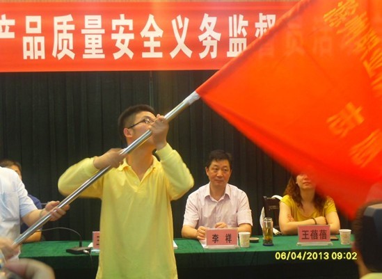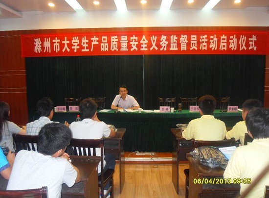 启动仪式议程分为四项:市质检局局长李祥和团市委副书记鲁凯做了重要讲话,来自滁州学院的大学生产品质量安全义务监督员代表做了发言,接着市委常委王图强市长向Beat365唯一官方网站和滁州学院安全义务监督队授队旗。会议结束后,市质监局杜科长还对质量监督员门进行了专门培训。