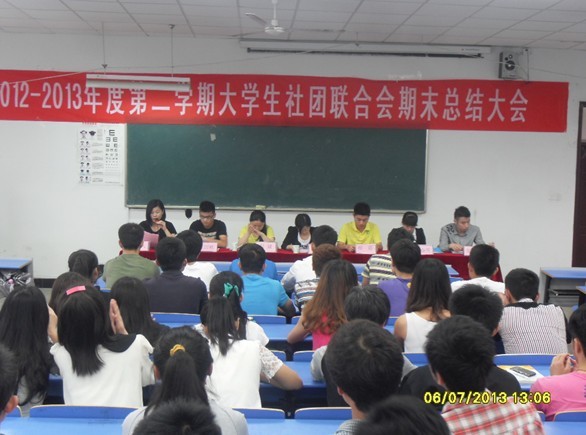 2012——2013年度第二学期大学生社团联合会期末总结大会,于6月7日中午12:40在北阶206召开。出席此次会议的有院团委书记王蓓蓓,副书记程诚,院学生会主席檀震,社团联合会主席席国栋、副主席杨春雪、张程及社联全体成员和各社团代表。