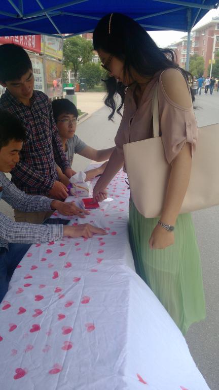 5月15日,在院团委、学生处的大力支持下,我院心理协会,在一号宿舍楼下,开展了名为“爱心传递手印心连心”的活动。该活动体现了本月心理健康宣传的主题“珍爱生命,责任同行”,活动以四川雅安地震为活动主题,通过将拇指手印,在白色的布面上印出心形,让同学们在参与活动的同时,寄托一份对四川雅安灾区遇难者的哀思,在活动现场,同学们积极参与,活动有序进行。