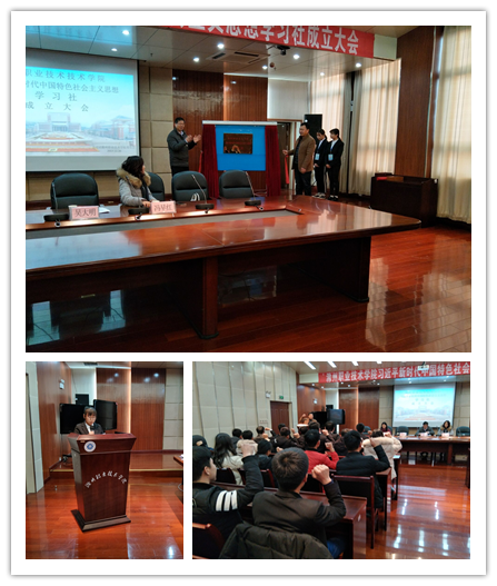 新社团代表车得珍发言,表示社团将在同学们中带头掀起学习宣传贯彻党的十九大精神热潮,进一步增强对习近平新时代中国特色社会主义思想的理解和认识,引领广大同学一起参与到学习研究活动中,通过丰富多彩的活动,不断推进习近平新时代中国特色社会主义思想深入到每一个青年学生的心中。指导教师孔金代表思政教师们表态,表示广大思政老师们与广大社员们想在一起,干在一起,将指导社团积极开展学习、交流、传播等系列活动,以切实行动推动习近平总书记治国理政思想在广大同学心中扎根、发芽、开花、结果。吴大明副院长为新社团揭牌并做讲话,他提出了三点要求,一是希望院团委立足青年教师和青年学生,以学生党员、学生干部和积极分子为主体,以习近平新时代中国特色社会主义思想学习社团和其他思政类社团为延伸,与思政部积极合作,建立理论学习基地和实践基地。二是希望新成立的社团以“学习”为重要抓手、以“传播”为重要使命、以“实践”为重要载体,把“习近平新时代中国特色社会主义思想”学习好、宣传好、践行好,利用课余时间开展理论学习、志愿宣讲、直观体验、参观调研、评比竞赛、联谊活动等形式多样的学习交流活动。三是希望思政老师们深刻把握“用习近平新时代中国特色社会主义思想武装大学生”对思政课教学的新要求,自觉把思政课教学放到高校立德树人的中心环节中去设计,将理论学习与社会实践和社团活动相结合,进一步落实学习和传播习近平新时代中国特色社会主义思想的成效。在一片热烈的掌声中,大会宣布结束。