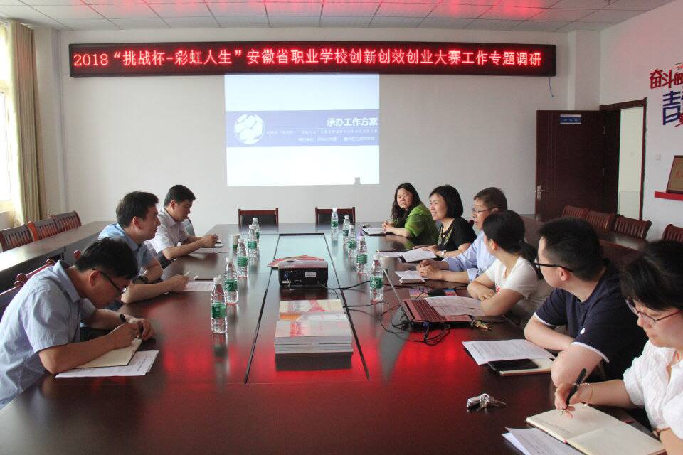 5月28日下午,团省委学校部副部长徐波、团省委学校部主任科员王磊、团省委学校部孙健国老师一行来校调研2018“挑战杯-彩虹人生” 安徽省职业学校创新创效创业大赛准备工作。团市委副书记郝仙红、学院副院长吴大明陪同调研。