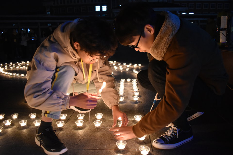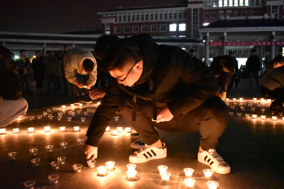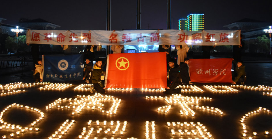 滁州学院代表丁政为此次悼念活动宣读公祭词。悼念现场摆放的和平烛呈现出“橄榄枝”环绕“12.13”、“南京”、“300000”的形状,昭示着那个永远无法忘却的日子。参加活动的人员手捧点燃的蜡烛有序、无声地走到指定位置,为南京大屠杀中30万遇难同胞默哀3分钟,时间仿佛在此刻凝固,现场气氛庄严肃穆。随后,同学们纷纷在横幅上签名以寄哀思。为了让同学们更深入,直观地了解当年那段黑暗的历史,在南阶205播放了抗日爱国影片《南京!南京!》,通过一帧帧真实生动的画面,大家共同回顾了81年前的惨痛历史,大家无不为侵华日军惨绝人寰的暴行所激愤,无不为国破家亡、生灵涂炭的那场灾难所叹息。