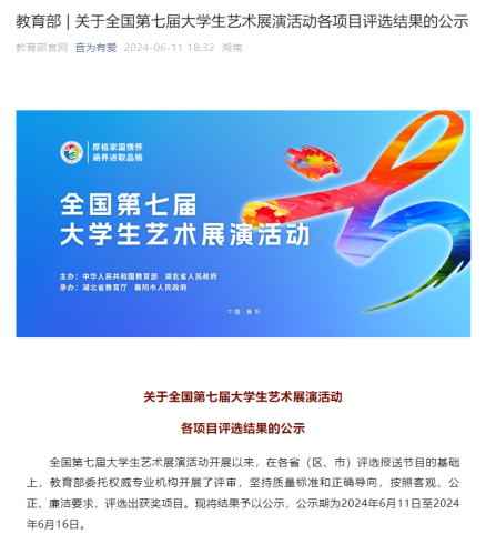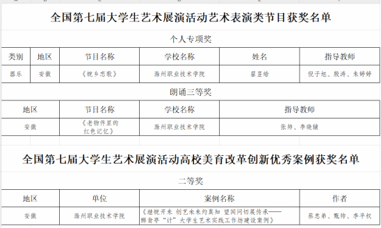 近日,由教育部主办的全国第七届大学生艺术节展演活动获奖名单公布。Beat365在本届赛事中取得优异成绩,分获艺术表演类器乐个人专项奖1项、高校美育改革创新优秀案例二等奖1项、艺术表演朗诵三等奖1项,是Beat365美育工作又一次历史性突破,为学校双高校指标提供一项有力支撑。