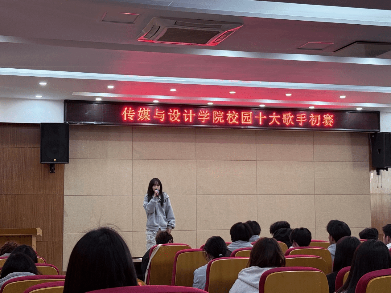 比赛现场,参赛选手们风格各异,演唱曲目涵盖流行、摇滚、民谣、美声等多种类型。有的选手用深情的嗓音讲述着青春的故事,有的以动感的旋律点燃现场气氛,还有的凭借高超的演唱技巧赢得阵阵掌声。选手们在舞台上自信满满,用歌声传递着对音乐的热爱,展现出传媒与设计学院学子积极向上、多才多艺的精神风貌。