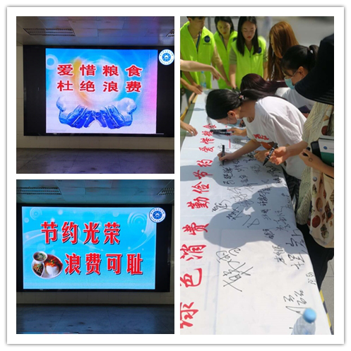 为深入贯彻落实习近平总书记对制止餐饮浪费行为重要指示精神,进一步营造浪费可耻、节约光荣的氛围,大力弘扬勤俭节约美德,2020年9月9日,后勤服务中心联合校团委在学生食堂开展“绿色消费 勤俭节约 爱惜粮食”为主题的拒绝“舌尖上的浪费”签名活动。同时在食堂LED大屏进行“节粮”宣传。