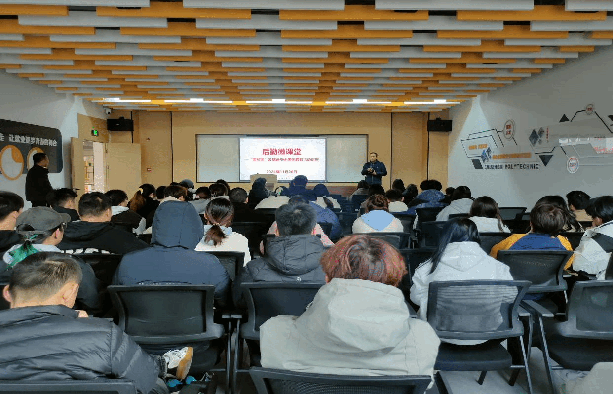 为强化“一站式”学生社区综合管理工作有序开展,充分发挥“一站式”学生社区的育人功能,打造“一站式”服务平台,加强学生公寓管理,提高学生宿舍安全意识,努力推进“平安校园”建设。11月20日下午,后勤服务中心在“一站式”学生社区综合服务中心举办了后勤微课堂—与学生“面对面”开展宿舍安全警示教育活动讲座,后勤服务中心主任顾宏才、公寓管理科科长李腾飞、公寓管理中心相关人员及违反宿舍管理规定的80余名学生参加了此次讲座。