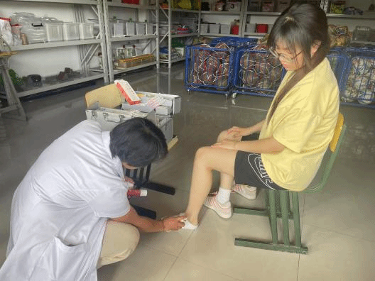 测试期间,健康驿站医护人员全程驻守田径场等测试区域,为学生提供健康咨询和运动损伤应急处理服务。针对体测期间出现的肌肉痉挛、低血糖、意外擦伤等突发状况,医疗团队第一时间开展冰敷镇痛、补充糖分、消毒止痛等专业处置,确保学生生命健康安全。此外,健康驿站还在现场普及科学运动知识,引导学生树立“安全第一、科学锻炼”的健康理念。