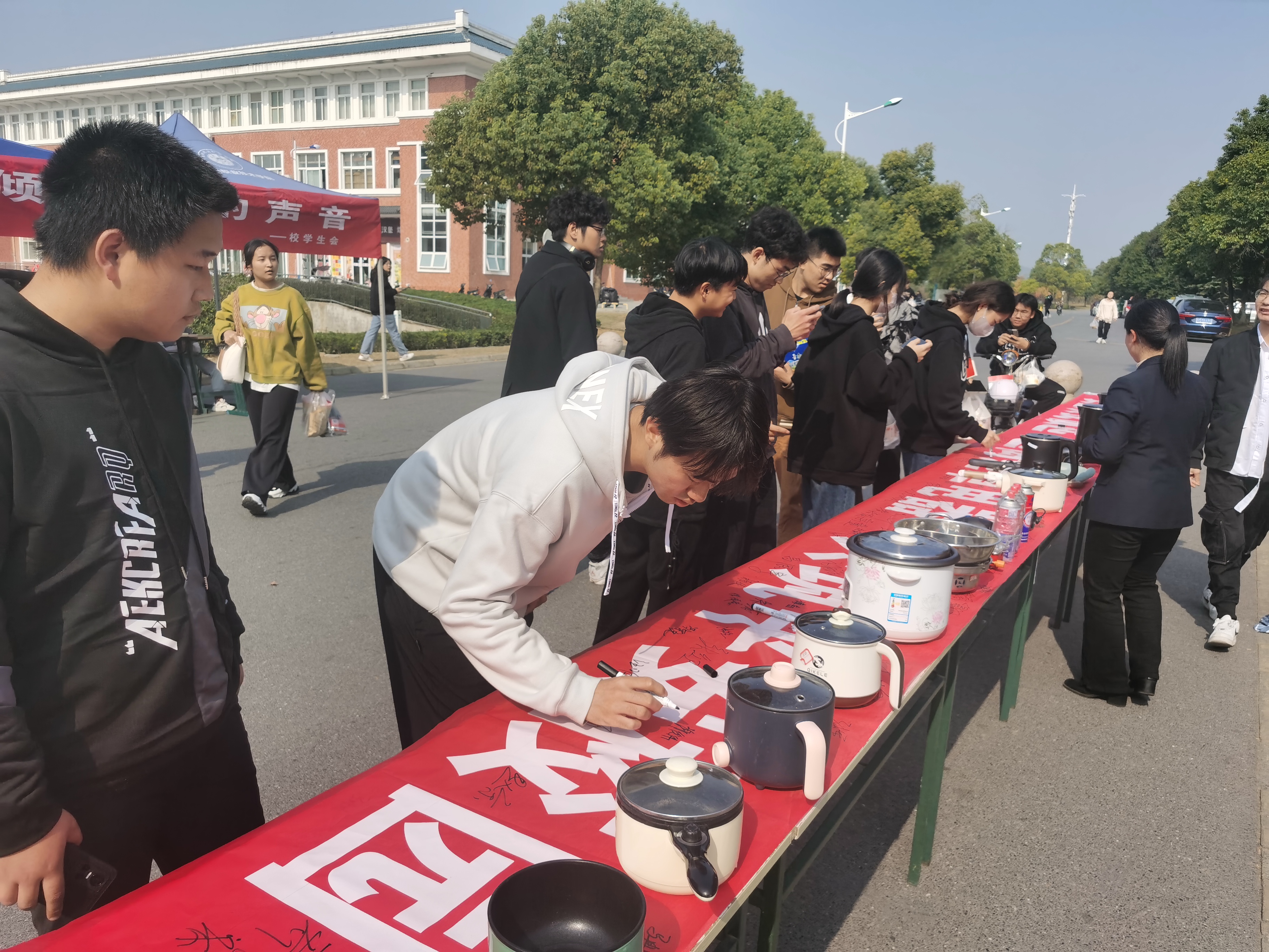活动现场展示了学生宿舍日常检查以及安全检查中收缴的电煮锅、吹风机、美发棒、电饭锅、电水壶、电热水袋、酒精炉等10余种违章电器。公寓管理人员现场讲解违章电器的危害,告诫学生禁止在宿舍内使用违章电器。现场还举行了“安全从我做起、远离违章电器、共筑平安校园”主题签名活动。下课的同学们纷纷驻足,在横幅上签名,一致表示将用自己的实际行动践行安全口号。