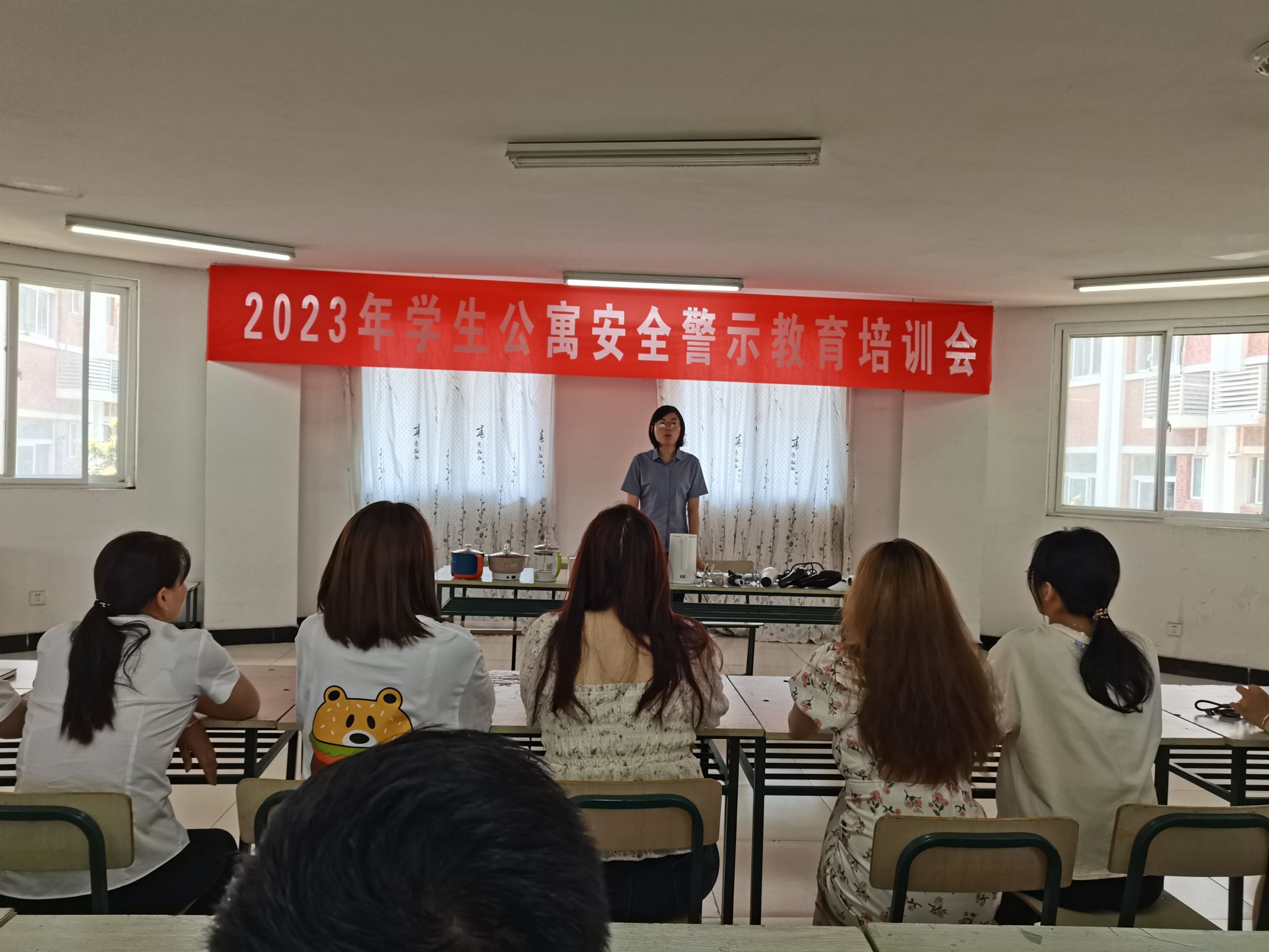 学生公寓是人员密集场所,安全责任重于泰山,此次培训的重点是让学生提高思想认识,加强安全意识。培训结合学生公寓日常检查中发现的私拉乱接、使用违章电器、宿舍抽烟等隐患逐一讲解,认真分析存在的安全风险。会上展示了学生公寓检查没收的部分违章电器,告诫学生违章电器的危害,并举例高校发生的违章电器引发的安全事故,让学生更加直观地感受违章电器的危害性。随后,通过与学生互动的方式对宿舍内发生火情如何进行自救等方面进行培训。最后,张茂丹呼吁参会学生代表以身作则,带动身边的同学一起做到,在宿舍不使用违章电器、不私拉乱接、不在宿舍抽烟,爱护消防器材,共同创建一个安全舒适、文明和谐的校园环境。