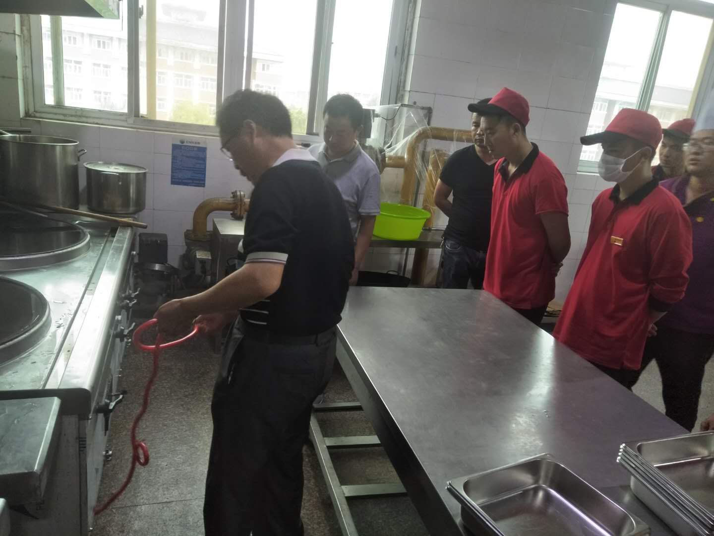 培训结束后,胡老师带领大家到食堂操作间内现场演示如何检查管道连接处的严密性,管道的锈蚀情况,以及易发生安全隐患部位。