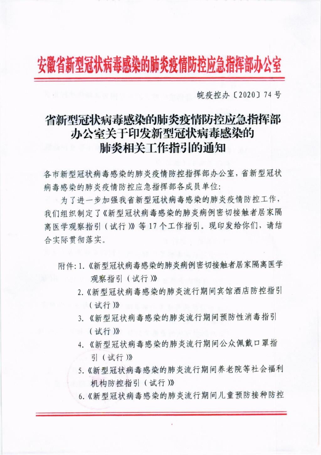 根据《安徽省教育系统新型冠状病毒感染的肺炎疫情防控工作领导小组办公室关于转发新型冠状病毒感染的肺炎相关工作指引的通知》(皖教防控办〔2020〕12号)文件精神,现将《新型冠状病毒感染的肺炎相关工作指引》(皖疫控办〔2020〕74号)相关部分内容转发给你们,请结合实际宣传落实。
