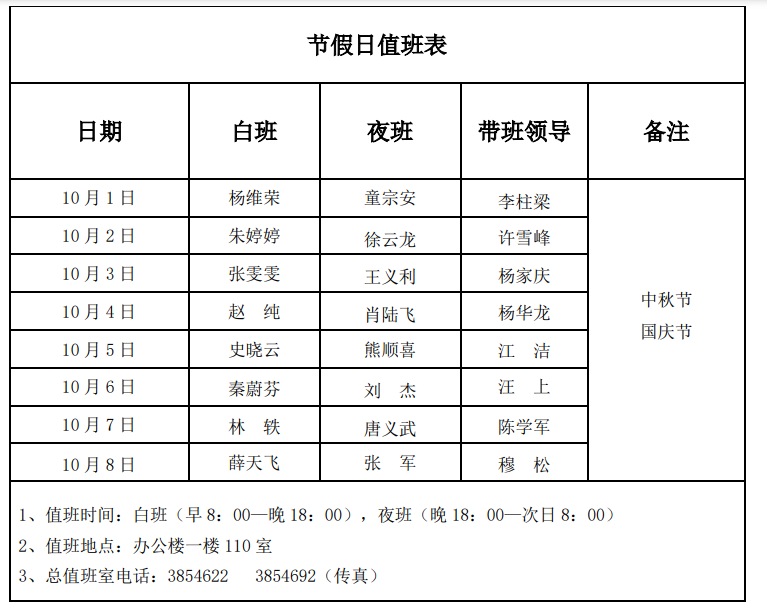 7、做好假期值班值守。假期值班人员要严格做好值班值守,领导干部要坚持在岗带班、外出报备制度,确保联络畅通,遇有重大突发事件,及时报告并妥善处理。学校总值班室设在综合楼一楼110室,实行24小时值班,值班电话是3854622,传真3854692。