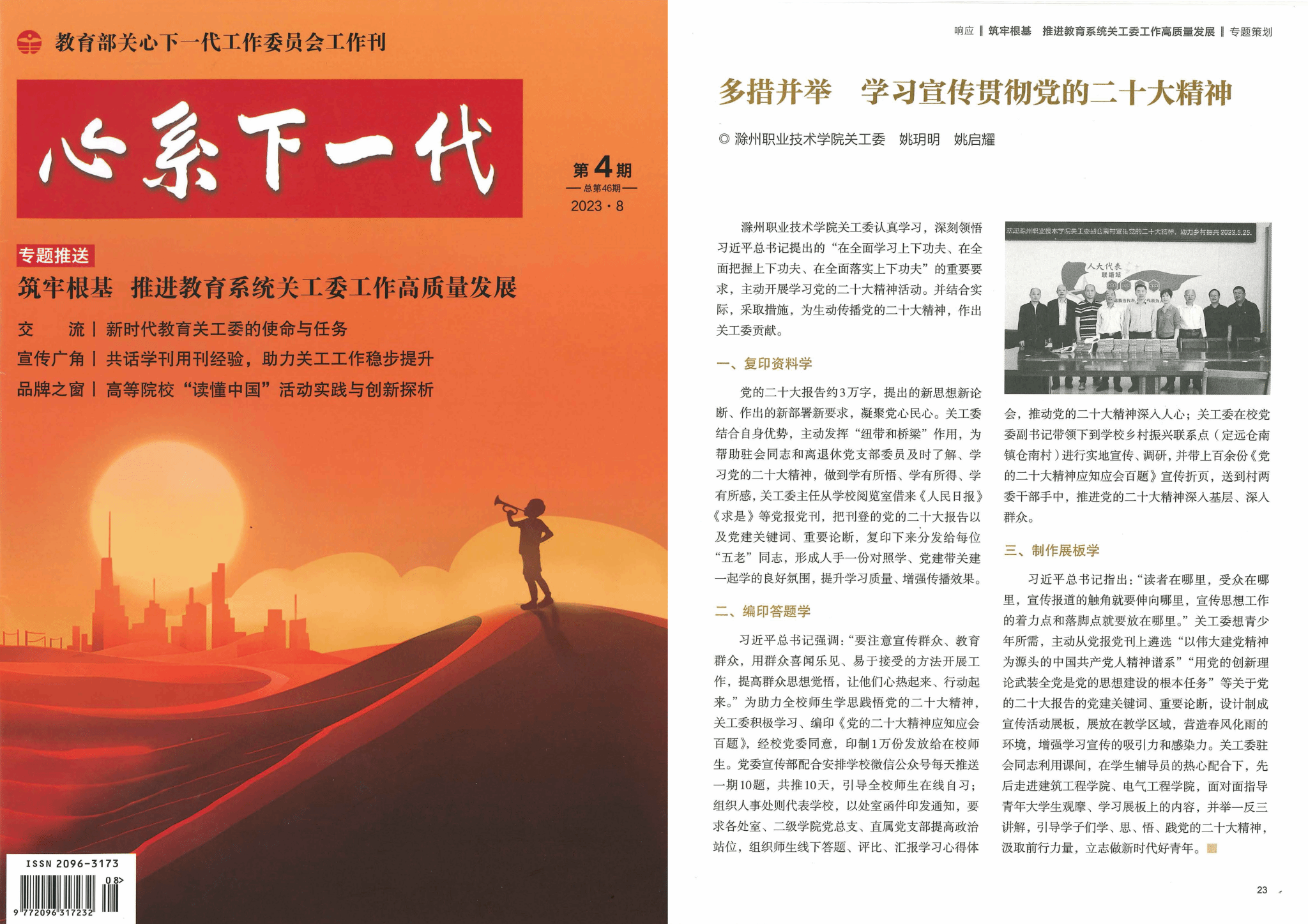 2023年是全面贯彻党的二十大精神的开局之年。中国关工委下发文件,要求各级关工委迅速掀起学习宣传贯彻党的二十大精神的热潮,并强调要把学习贯彻落实党的二十大精神同习近平总书记对关心下一代工作作出的重要指示批示精神结合起来,同落实中办国办《意见》结合起来。Beat365唯一官方网站关工委在校党委的正确领导下,深刻领悟习近平总书记“在全面学习上下功夫、在全面把握上下功夫、在全面落实上下功夫”的重要要求,结合实际、采取措施,助推党的二十大精神宣传走深走实。具体做法得到教育部关工委的认可,并安排在《心系下一代》杂志第4期“专题策划:筑牢根基 推进教育系统关工委工作高质量发展”栏目刊发,这对宣传学校在全国教育系统影响力,起到积极作用。