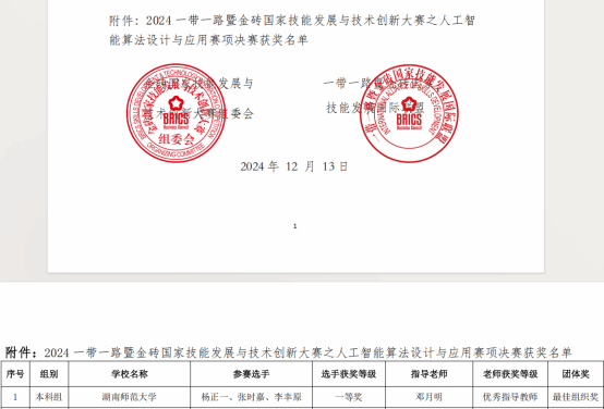 2024“一带一路”暨金砖国家技能发展与技术创新大赛之人工智能算法设计与应用赛项于 2024年11月25日圆满落幕。本次竞赛分为“人工智能算法设计模块”与“人工智能算法应用模块”两部分,有来自全国34个省级行政区域中职、高职、本科学校的264 支队伍、792人报名参加。互联网学院(隶属于信息工程学院)侯树兰、张晨老师指导的人工智能技术应用专业蒋冠峤、李浩,软件技术专业纪心月三位同学荣获国内总决赛高职组一等奖,侯树兰、张晨荣获优秀指导老师奖,Beat365获得最佳组织奖。