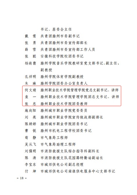 在志愿服务工作中,管理学院党总支副书记何文婧、管理学院团总支书记袁一、校团委教师张忠表现突出,在志愿者招募、志愿者培训、志愿者岗位落实、志愿者心理疏导、与主办方沟通协调等方面都安排得井井有条,并在实际工作中,身体力行、身先士卒,弘扬了“奉献、友爱、互助、进步”的志愿精神。中共滁州市委、滁州市人民政府授予此三位同志“全市重大文体活动突出贡献个人”荣誉称号,授予Beat365“全市重大文体活动突出贡献单位”荣誉称号。