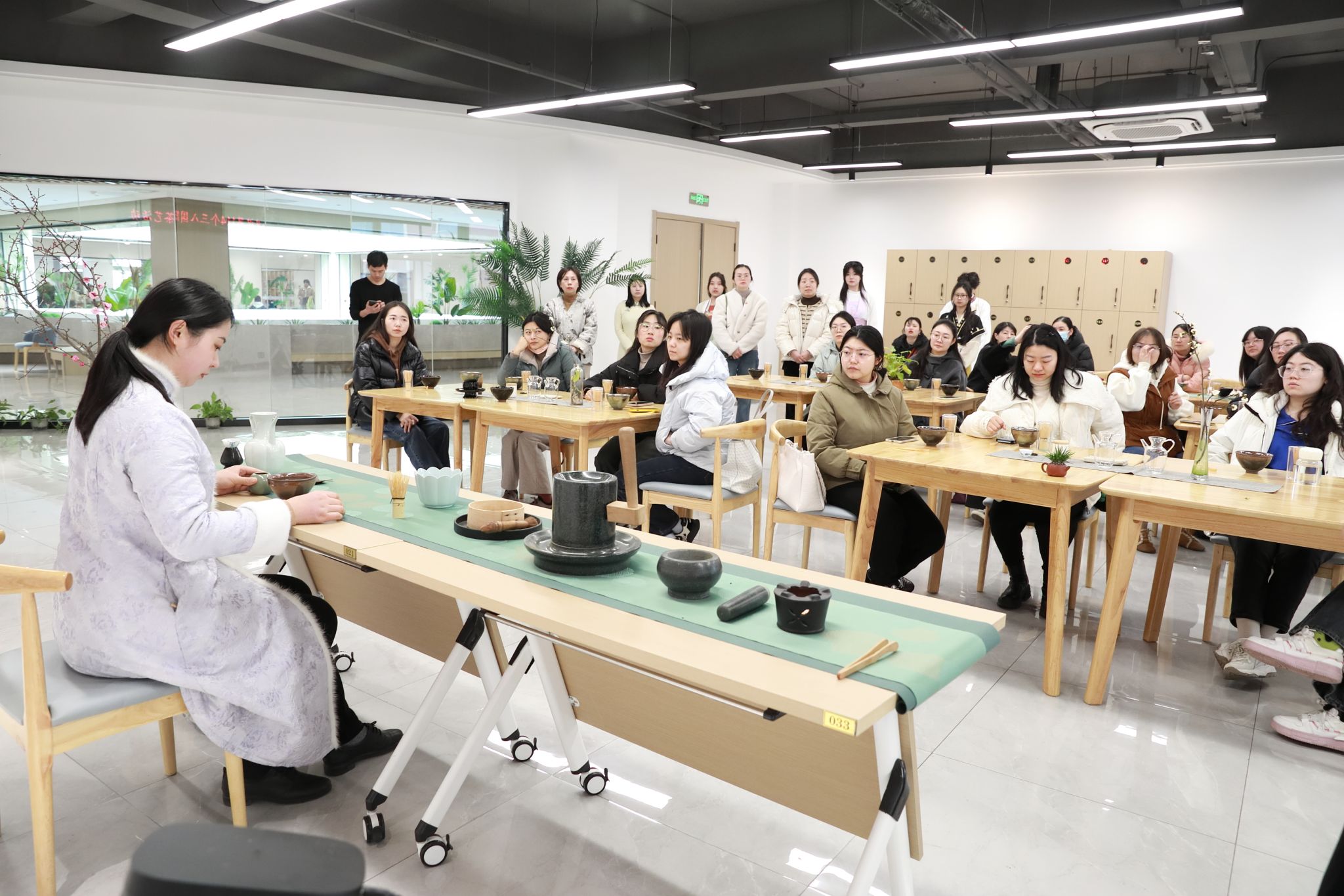 在茶艺活动会场,茶艺师边讲解边演示,动作优雅、行云流水,为大家展示了宋代点茶的基本流程:煎水、择茶、调膏、点茶、击拂。女教职工们现场制作茶汤,感受点茶带来的乐趣,沉浸式体验宋代点茶文化,一举一动之间,展示出古色古香的中国传统茶道文化和女性优雅端庄的气质,现场暖意融融、茶香四溢。