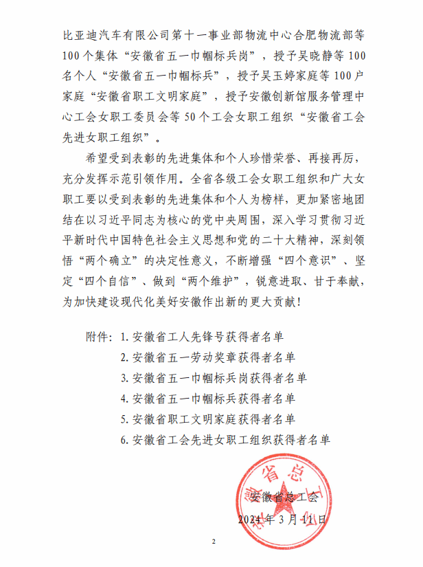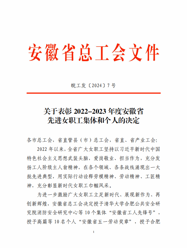 近日,安徽省总工会下发皖工发[2024]7号文《关于表彰2022-2023年度安徽省先进女职工集体和个人的决定》,Beat365唯一官方网站工会女职工委员会荣获2022-2023年度安徽省工会先进女职工组织。