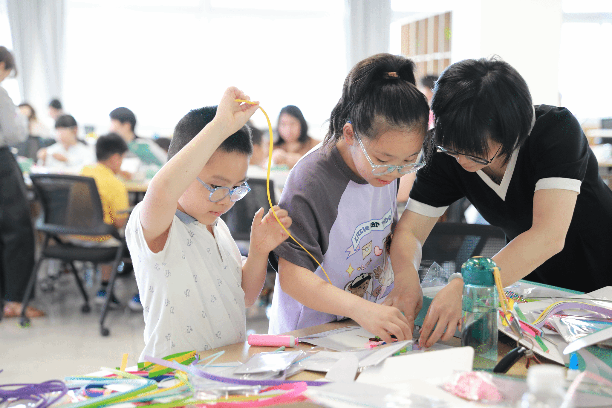 活动现场,传媒与设计学院的吴彦老师为大家讲解了常用的衍纸工具,介绍了紧卷、松卷等制作方法的关键步骤,同时,展示了多幅色彩斑斓、生动传神的衍纸作品,点燃了孩子们对于衍纸手工的浓厚兴趣。活动开始后,孩子们在家长的协助下,通过卷、捏、拼、粘等手法,制作了一个个小零件,最终组合成各式各样的充满了创意与童趣的作品,不仅提高了大家的动手能力,更感受到了衍纸的非遗魅力。