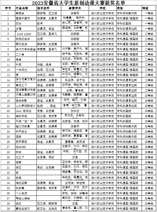 安徽省大学生原创动漫大赛由安徽省教育厅主办,安徽工程大学承办,是安徽省大学生学科和技能竞赛B类赛事,也是艺术类专业重要的学科竞赛之一。此赛项我院已连续多年参加,获奖奖项涵盖动画类、漫画/插画类、动漫周边、游戏美术类等,本次获奖数量、质量再创佳绩,是我院动漫专业深入贯彻落实立德树人根本任务,促进学生全面成长的又一个标志性成果。