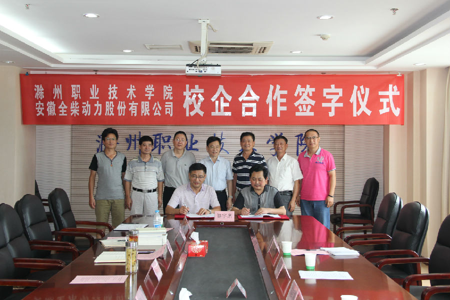 近日,滁州职业技术学院与安徽全柴动力股份有限公司校企合作签约仪式在学院综合楼八楼会议室举行。全柴公司人事总监夏守武、人力资源部经理郑启斌、培训招聘主管彭尚友,学院院长李柱梁,院长助理、招生就业处处长穆松,教务处处长张延义、汽车系书记苏有良、机电系主任杨思国参加了签约仪式。签约仪式由招生就业处副处长李超主持。