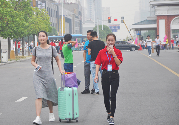 迎新现场还活跃着众多热情洋溢的青年学生志愿者。他们身着统一服装,或帮助运送行李,或指引校园道路,或介绍学院概况,用自己最真诚的爱心化作为微笑和汗水,为远道而来的学弟学妹们送上了贴心的问候和周到的服务。