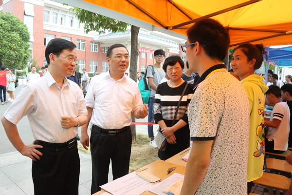 院党委书记杨甫祥,院党委副书记、院长李柱梁来到迎新接待点,向正在紧张忙碌的工作人员表示慰问,并仔细询问了新生报到情况,叮嘱学院工作人员一定要把迎新工作做细、做实,让家长们放心,让每一位新生都感受到学院的关心和爱护。杨甫祥、李柱梁还与新生及家长亲切交谈,对远道而来的家长表示慰问,对新同学的到来表示热烈欢迎,送上最真挚的关怀。