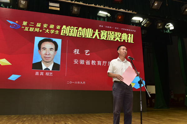 大赛组委会主任委员、安徽省教育厅厅长程艺出席颁奖典礼并讲话。他希望大赛能进一步推动全省高校创新创业教育改革、加强高素质复合型人才的培养、加强创新创业教育的相互学习、交流合作。省厅将以本次大赛为契机,选派优秀作品,在全国“互联网+”大学生创新创业大赛的舞台上进一步展示安徽高校和青年学子的风采。