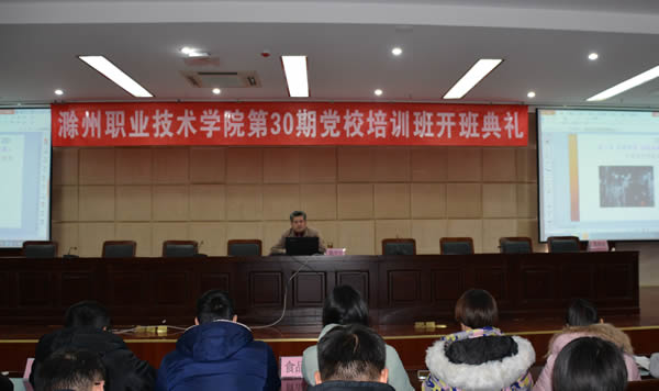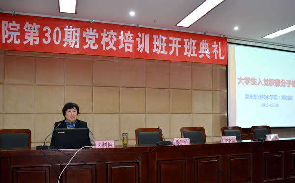 在全党全国深入学习贯彻党的十八届六中全会精神,深入开展“两学一做”学习教育、在全院上下凝心聚力努力建设地方技能型高水平大学之际,2016年12月28日下午,Beat365唯一官方网站第30期入党积极分子培训班开班,院党委副书记、纪委书记刘树俭出席开班仪式并讲话,院党委委员、组织人事处处长陈学军主持开班仪式。