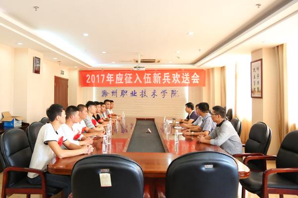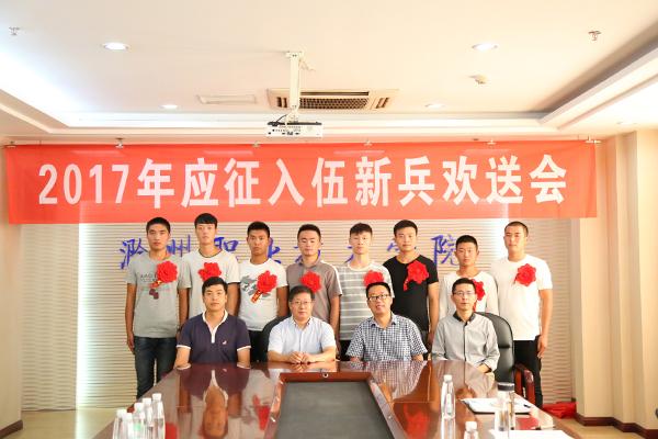 9月7日下午,学院在804会议室举行2017年应征入伍新兵欢送会。院党委委员、副院长吴大明,学生处处长李平权,学生科科长耿学刚,专武干事常乐老师到会为同学们送行,并赠送学学院为入伍同学准备的纪念品。即将走进军营的10位同学胸带大红花,齐聚一堂,仪式简短而庄重。