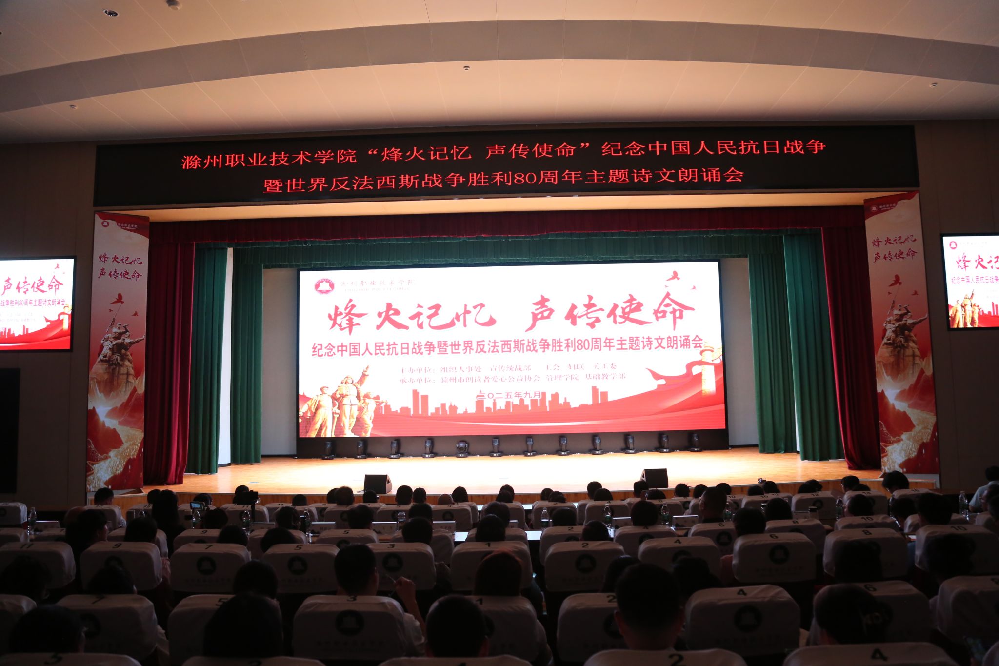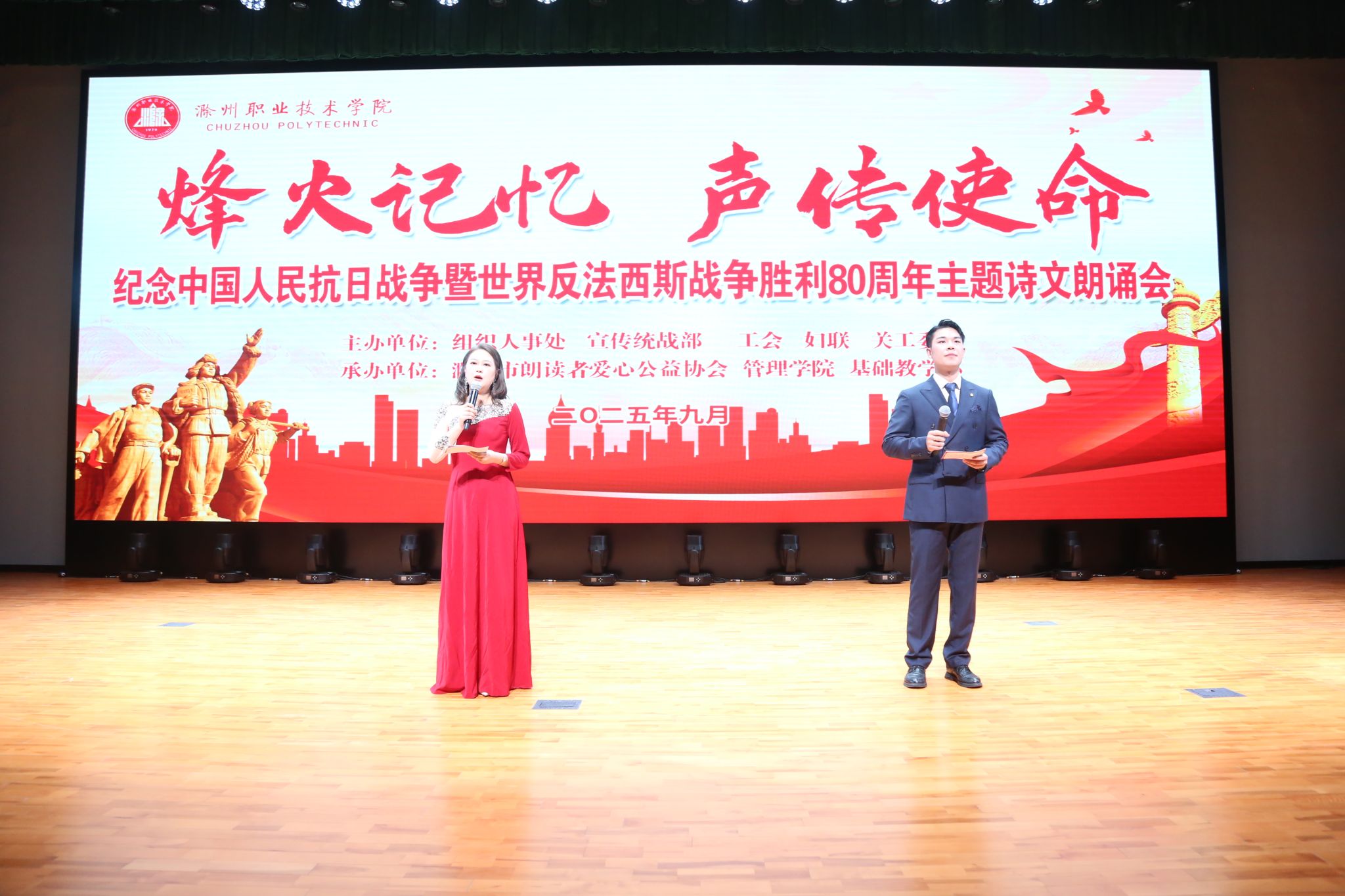 为铭记历史、缅怀先烈,以弘扬伟大抗战精神凝聚起全校师生的爱国主义情怀,9月3日下午,由学校组织人事处、宣传统战部、工会、妇联、关工委联合主办,滁州市朗读者爱心公益协会、管理学院、基础教学部联合承办的“烽火记忆 声传使命——Beat365唯一官方网站纪念中国人民抗日战争暨世界反法西斯战争胜利80周年”主题诗文朗诵会在6号楼报告厅举行。校党委书记陈飏,党委副书记、校长许雪峰,滁州市朗读者爱心公益协会会长陈华,校领导李平权、李超、王冬、王宇等出席。