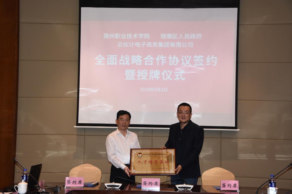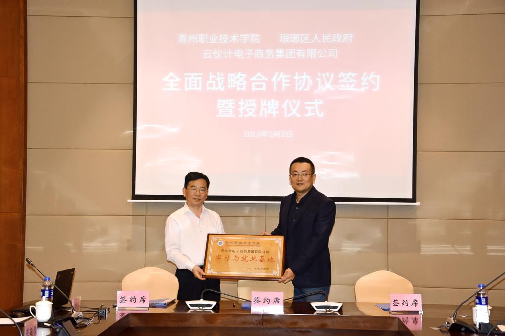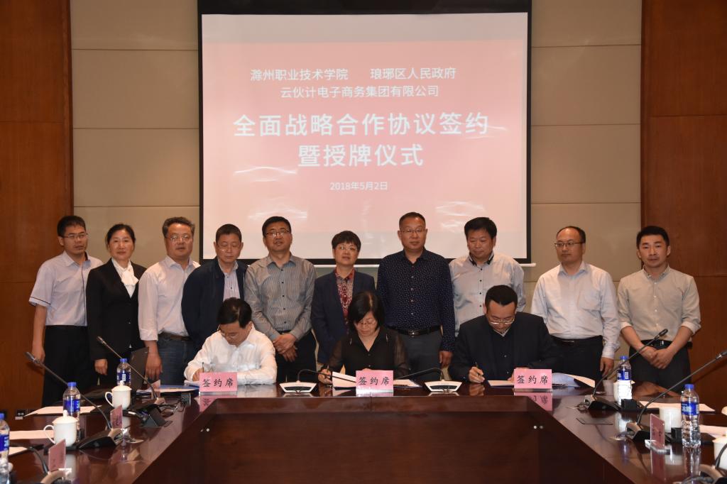 5月2日下午,学院与琅琊区人民政府和云伙计电子商务集团有限公司签订全面战略合作协议。