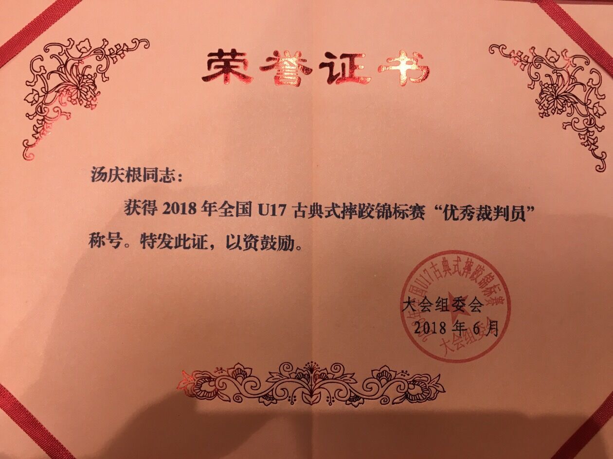 我院教师汤庆根在一周的比赛执裁中,执裁水平得到领导和裁判员们的认可,获得本次赛事“优秀裁判员”称号,为我院今后开展摔跤项目发展带来了机遇。汤庆根老师是经国家体育总局、中国摔跤协会批准,我市唯一一名“国家级裁判员”。