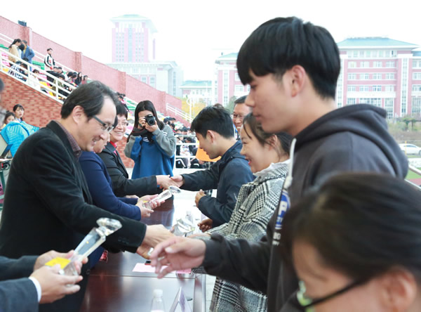 闭幕式上,本次运动会裁判长陈茂勇宣布了竞赛成绩。校领导为荣获团体奖项的集体颁发了奖杯。
