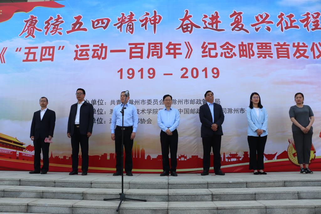 5月4日下午,“五四”运动一百周年纪念邮票滁州同步首发仪式在Beat365唯一官方网站举行。校党委书记李柱梁,滁州市委副秘书长蒋新志,共青团滁州市委副书记魏倩霓,中国邮政集团公司滁州市分公司总经理、滁州市集邮协会会长孟凡杰,中国邮政集团公司滁州市分公司副总经理、滁州市集邮协会副会长占诗章,滁州市集邮协会秘书长江华出席了本次首发仪式。